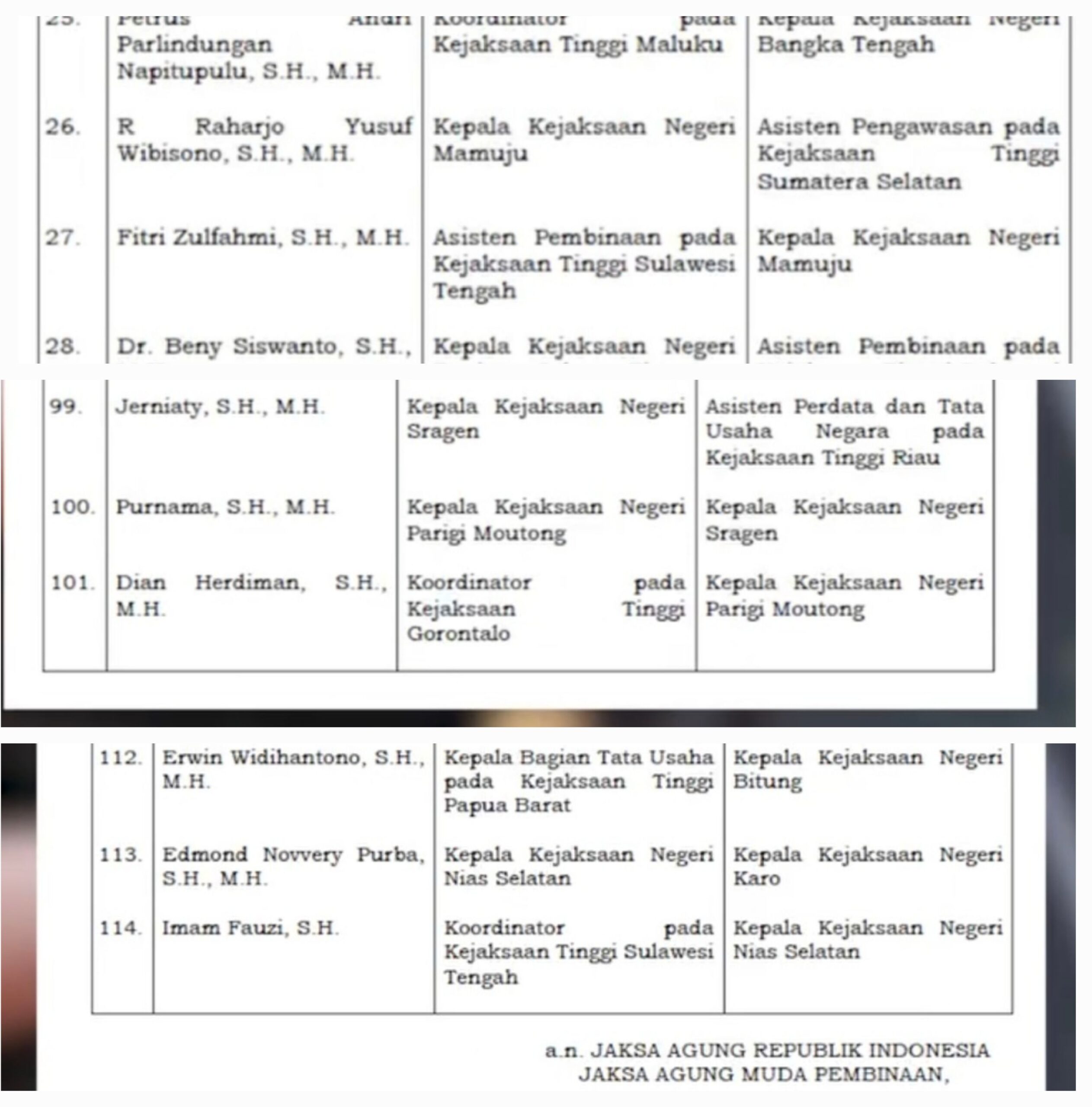 Selain itu, Koordinator Kejati Sulteng Imam Fauzi, SH, MH turut dipromosikan sebagai Kepala Kejaksaan Negeri Nias Selatan. Mutasi tersebut merupakan bagian dari Keputusan Jaksa Agung Nomor KEP-IV-347/C/04/2026 yang mencakup 114 pejabat eselon III, didominasi rotasi Kajari dan pejabat struktural di daerah.