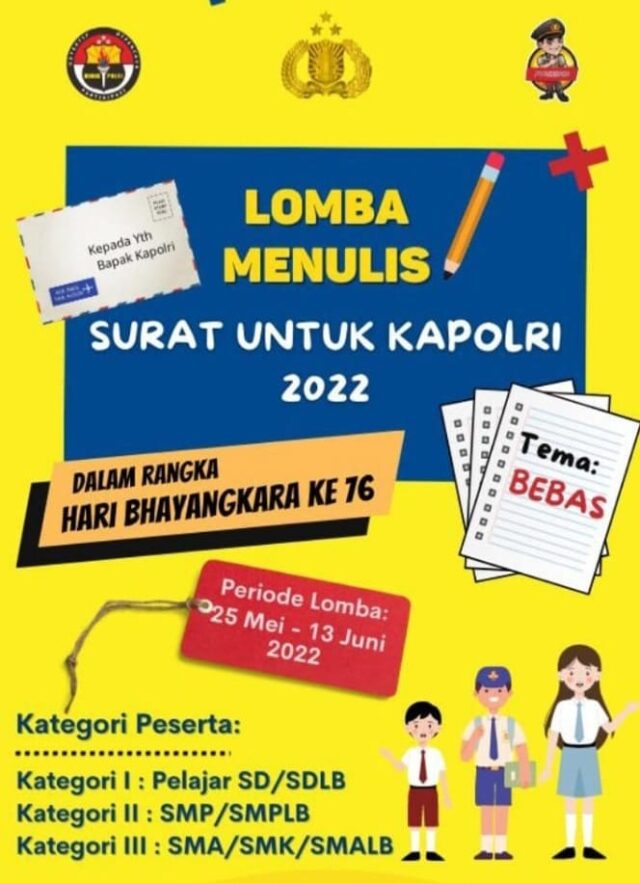 Bahanaindonesia.com – Menyambut hari Bhayangkara ke-76, Kepolisian Negara Republik Indonesia (Polri) menggelar lomba menulis surat dengan tajuk “Surat untuk Kapolri Jenderal Listyo Sigit Prabowo 2022”. Lomba ini akan memperebutkan piala Kapolri Jenderal Polisi Listyo Sigit Prabowo.