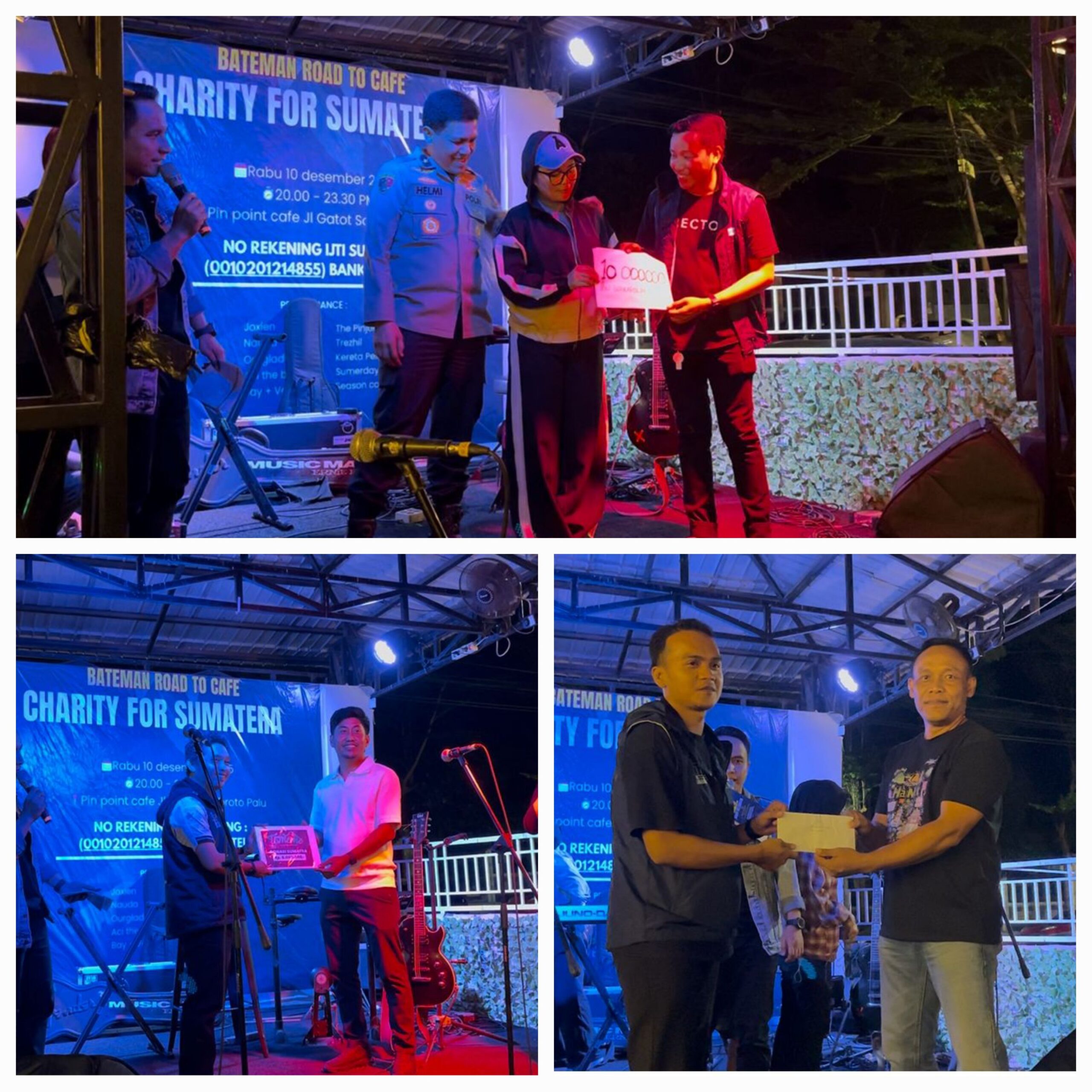 PALU, Bahanaindonesia.com – Ikatan Jurnalis Televisi Indonesia (IJTI) Sulawesi Tengah bersama Bateman Production menggelar aksi penggalangan dana bertajuk Charity for Sumatera sebagai bentuk kepedulian terhadap korban bencana di Sumatera Utara, Sumatera Barat, dan Aceh. Kegiatan yang dilaksanakan di Kota Palu tersebut mendapat dukungan dari berbagai kalangan, mulai dari komunitas jurnalis hingga aparat kepolisian. Rabu 10/12/2025 Malam.