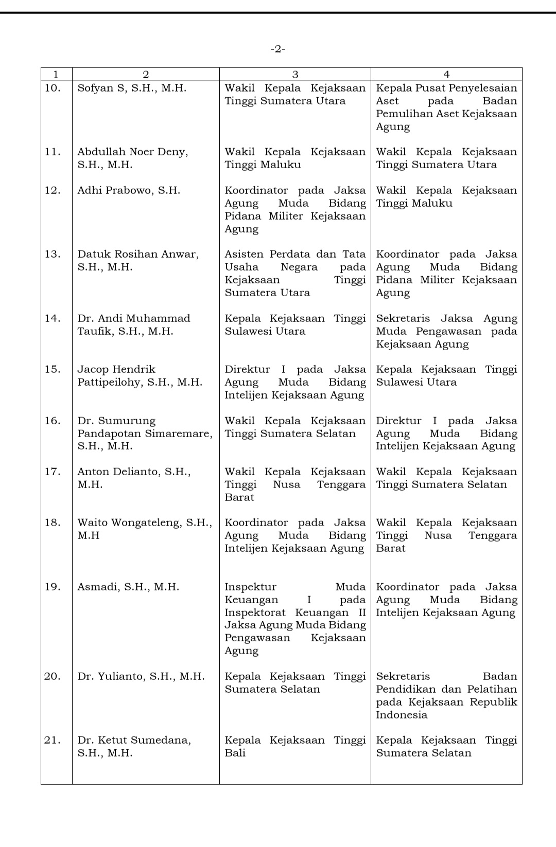 Dalam surat keputusan Jaksa Agung Sanitiar Burhanuddin tersebut, juga menuliskan sejumlah nama Kepala Kejaksaan Tinggi dari berbagai daerah serta pejabat eselon II lainnya yang mendapatkan penugasan baru.