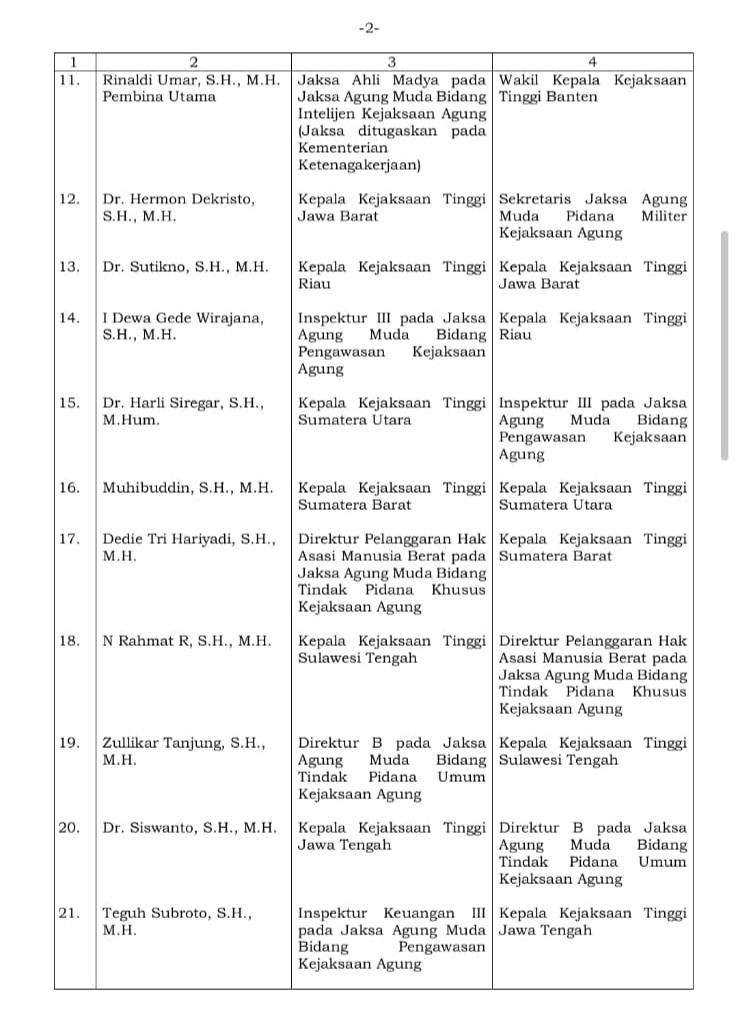 Kebijakan ini tertuang dalam Keputusan Jaksa Agung Republik Indonesia Nomor 488 Tahun 2026 tertanggal 13 April 2026. Tercatat, sebanyak 14 Kepala Kejaksaan Tinggi (Kajati) mendapat promosi jabatan baru sebagai bagian dari penyegaran organisasi dan optimalisasi kinerja institusi.