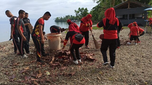 Bahanaindonesia.com – Puluhan ibu-ibu Bhayangkari bersama keluarga dan personil Brimob dari Kompi 1 Batalyon B Pelopor terlihat sibuk membersihkan pantai Moengko yang berada di kota Poso.